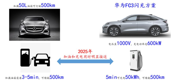 事实上,高电压平台的最大价值,就是实现真正意义上的快充,通过提升充电功率,从根本层面彻底解决充电焦虑。根据华为FC3闪充解决方案,其2025年充电电压可提升至1000V,充电功率达到600kW,相当于5分钟即可充电50kWh,可实现续航约500km,这个补能速度已经和加油非常接近,如果实现,这将是振奋人心的。