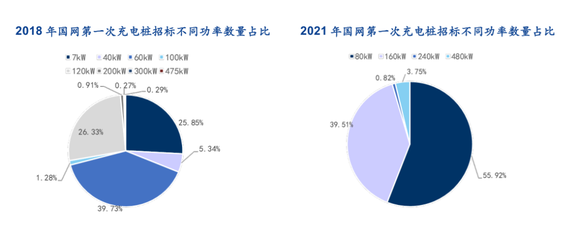 图4:2018年和2021年国网第一次充电桩招标不同功率数量占比,资料来源:充电桩视界,安信证券