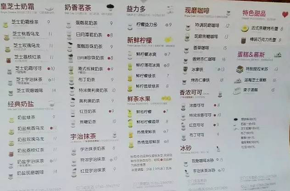 虽然如今大家这张菜单的设计风格褒贬不一,但从当时来看,这张菜单带给人的感觉,已经跳出“奶茶店”的格局。
