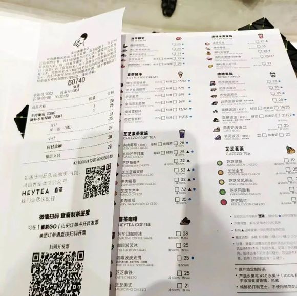 这也是很多上海人对喜茶的最初记忆:在来福士门口排队,1名喜茶工作人员拿着这张黑色菜单,介绍喜茶产品,并记录每一个顾客的点单。