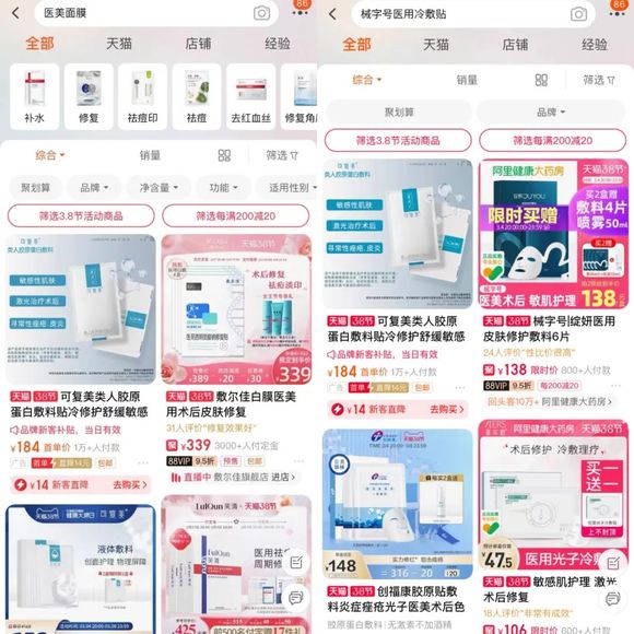 事实上,不论是主动贴上,还是消费者给予,顶着“医美面膜”的标签,在传统面膜价格体系崩溃后,售价不低的“械字号”产品确实吃到了不少红利。