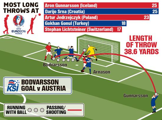 这粒进球和冰岛队小组赛击败奥利地时打入的进球几乎如出一辙,两粒进球同样是由贡纳尔松的大力界外球发起,随后利用队友超强的高空对抗能力争顶下来创造破门良机。据统计,在此前的三场小组赛中,大胡子队长贡纳尔松一共25次利用掷界外球的方式发动进攻。