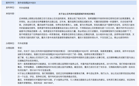 重庆市外经委在公开信箱中回应,“对于迪士尼集团西部项目,我们高度重视,目前正在积极筹备对接落地方案,参与选址竞争。我们认为,迪士尼此次新项目选址将经历一个比选、评估、竞争的过程,我市有机会也有可能承接此项目。”
