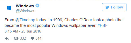 近日,微软Windows官方推特发布信息称,“1996年,查尔斯·奥利尔拍摄了这张史上最火的Windows壁纸”。
