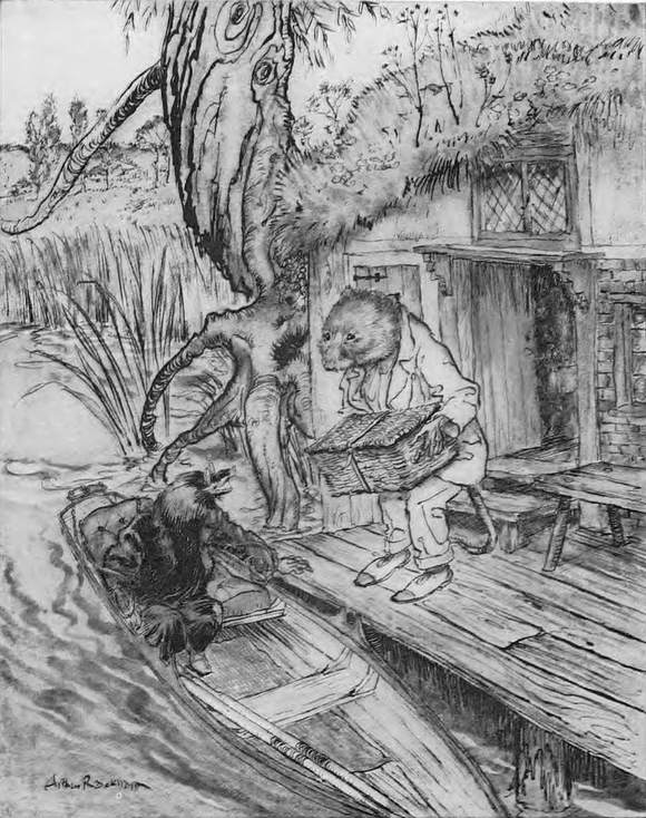 鼹鼠领着河鼠回到简陋的鼹园,最重要的事就是要好好请河鼠吃一顿,可是他的家中只有罐头和香肠,没有面包和黄油,这令他悲伤地呻吟,还是笑嘻嘻的河鼠安慰了他。《柳林风声》重要的时刻主角们总在吃饭,烹饪是所有家庭里的重要主题——鼹鼠与河鼠第一次见面时,一起愉快地享用郊游野餐,长长的食物清单像是一种文学戏仿;在暴风雪艰难行路后,两个小伙伴在獾家受到了热情款待,厨房和饭菜代表着他们已经经受了考验,一切都稳定下来,獾的厨房桌子像是牛津与剑桥大学餐厅里的桌子,在《哈利·波特》里我们也可以看到这样的餐厅范例;就连蟾蜍入狱之后幻想的,也是蟾府里餐桌摆放妥当的叮当声。