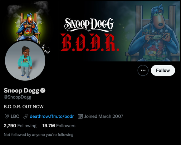 为了经营好自己的个人IP,Snoop Dogg下足了功夫。社交媒体上的他异常活跃,目前已发布超4万条推特,平均每个月200多条。同时,他还将事业拓展至电影、游戏、体育、烹饪等多个领域,据统计,出道至今,Snoop Dogg已参演了47部电影。自2014年为《使命召唤·幽灵》配音以后,最近这款游戏还曝出将推出Snoop Dogg形象的皮肤。