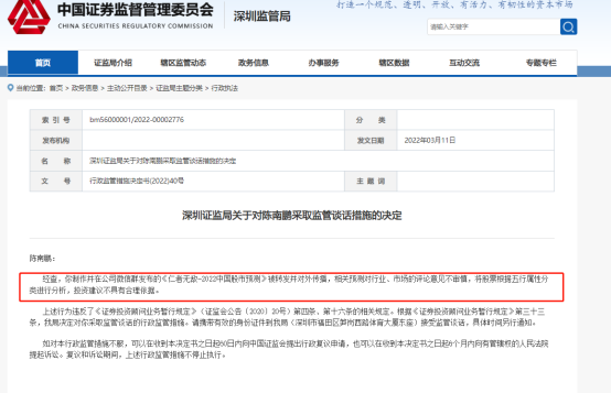 2022年3月11日,深圳证监局对陈南鹏采取监管谈话措施的决定,称“研报内容中,陈南鹏将股票按五行属性分类进行分析预测,且对行业、市场的评论意见不审慎,投资建议不具有合理依据”。