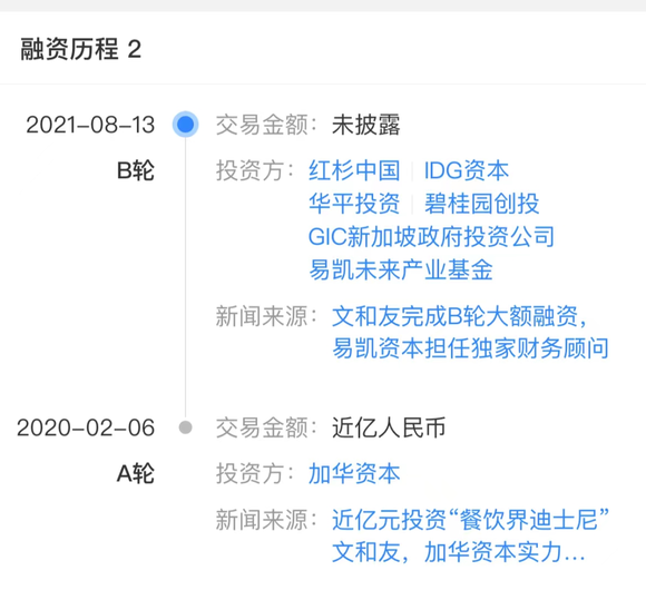 线上线下的火爆自然引来资本的入驻。2020年,文和友拿到了加华资本近亿元人民币投资。2021年,红杉资本中国、IDG资本、碧桂园创投、易凯资本等都将目光投向文和友,并于2020年8月完成B轮融资。据多家媒体报道,B轮融资完成后的文和友估值达百亿。