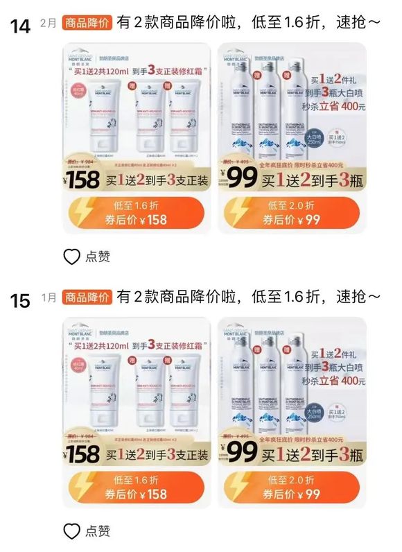 同属淘系,勃朗圣泉中国总代店铺中所有产品低至1.6折,买赠力度惊人。与此同时,不少C店在售卖勃朗圣泉临期产品,售价甚至更低,该店铺表示系品牌清仓所致。
