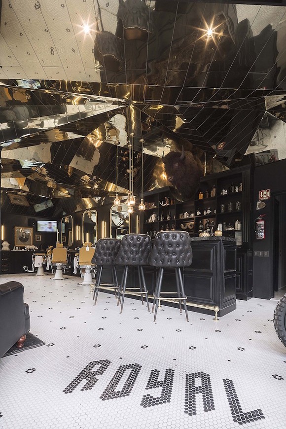 正如名字中带着“皇家(Royal)”字样,走进店里,铺面而来的就是奢华气息——进门处的地砖上,也有有小砖块拼出的Royal字样。整个空间中最显眼的是整个店铺都被金色镜面天花板投下的光笼罩。而黑色大理石面的吧台、黑色皮质沙发和高脚椅,以及摆满各种复古摆件和美发产品的柜子都让整家店更有一种神秘、高冷的感觉。对了,也许你抓住了重点,这家店里有吧台和高脚椅。在等待美发服务的同时,你完全可以先给自己来上一杯。