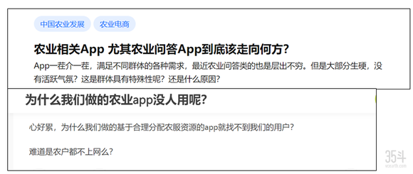 农民希望通过手机APP实现种植管理、学习、售卖等目的,企业希望农民在APP上产生更多的交易。然而,现实情况是,农民找不到满意的APP,农业APP找不到用户。当我们搜索“农业APP”时,我们发现了上图中的发问——“为什么我们做的APP没有人用”、“农业APP到底该走向何方?”。这也是35斗希望在本文中探讨的问题。