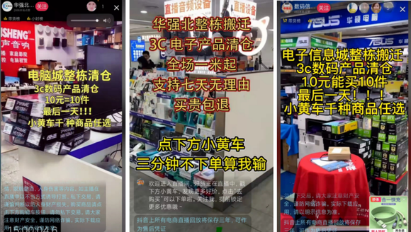 至于画面中央,大多标着抓人眼球的宣传语:“华强北商城整栋搬迁”、“商家柜台退租”、“受疫情影响撤柜”、“3C数码清仓一件不留”、“十元十件商品”……