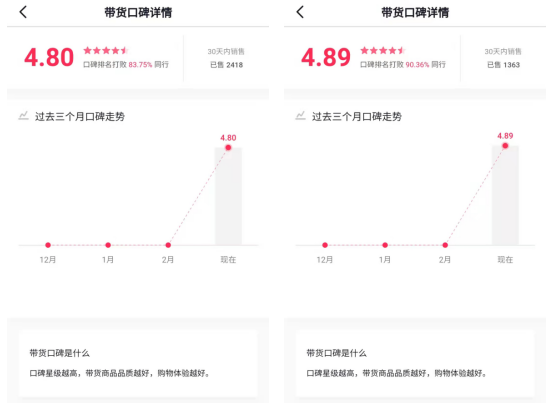 进一步观察,可以看到绝大部分直播账号的详情显示,都只有三月份的口碑记录,很多都是“最近一个月内刚刚注册的新账号”。