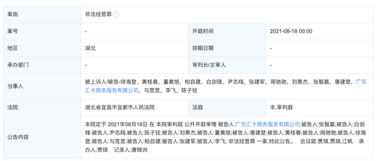 2021年8月,公开信息显示,广东汇卡开庭公告则显示为“非法经营罪”。
