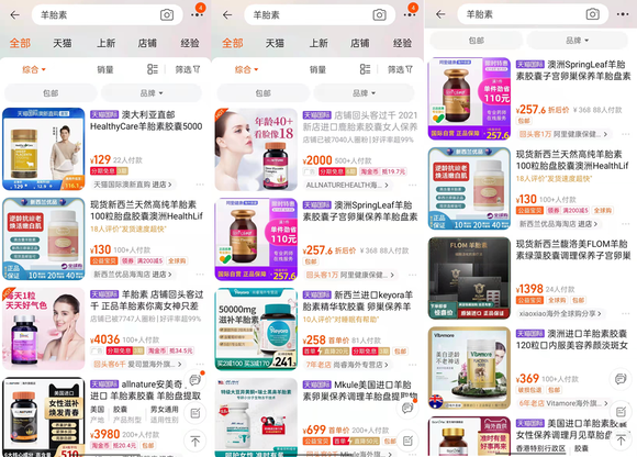 不过,羊胎素美容的热潮并没有因此而消退。目前,羊胎素更多以保健品和化妆品成分的形式出现。在淘宝平台和天猫国际平台上有不少在售的“羊胎素胶囊”,它们宣称的功效不仅限抗衰老,还包括调理女性健康、增强免疫力、增强记忆力等功能。相关保健产品的产地主要来自澳洲、新西兰、美国等地区,价格区间大约为120元-680元/瓶。