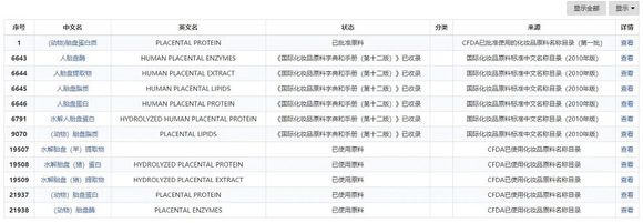 值得注意的是,《国际化妆品原料标准中文名称目录》中还包含人胎盘提取物等成分。据了解,在世界范围内,只有日本和韩国可以合法生产人体胎盘素。不过,日本的人体胎盘素仅限于临床医疗使用,而化妆品成分中的胎盘提取物,大多来自于猪、羊、马等动物胎盘。