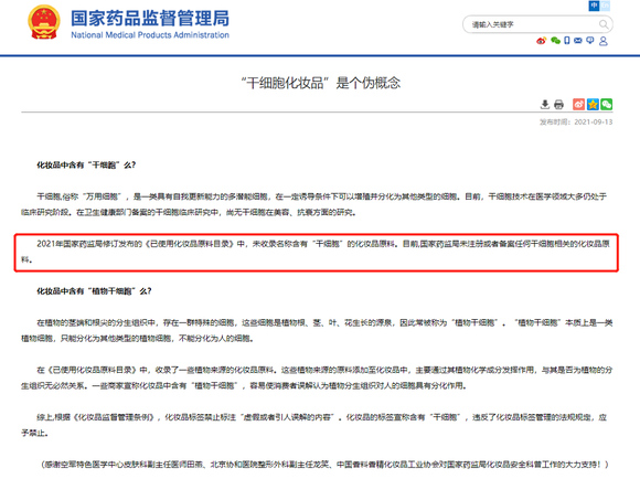 截图自药监局科普文《“干细胞化妆品”是个伪概念》