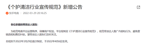 3月29日,快手电商发布《个护清洁行业宣传规范》(下称“规范”)新增公告。规范于4月6日生效。