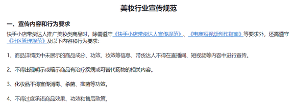 快手在2月28日新增《美妆行业宣传规范》中提到,美妆产品不得宣传详情页中未展示的成分、功效、妆效;不得宣称医疗作用;不得过度承诺;不得过度美化宣传图片或诋毁同行等。