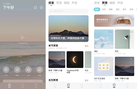 硅谷精英们对冥想的认可,也让正念冥想类APP估值水涨船高,全球两大独角兽Calm和Headspace在经历几番融资后,估值均超过20亿美元。在国内,冥想类app潮汐、Heartly lab、FLOW冥想也获得了千万级人民币投资。