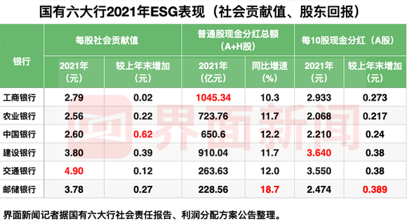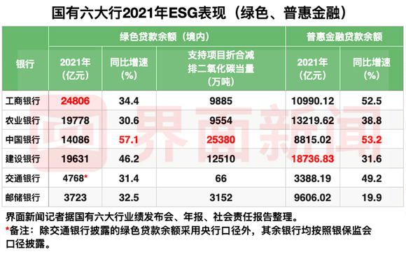 从国有六大行信息披露的角度来看,各银行披露内容、侧重点、数据统计口径等方面略有差异,因此,界面新闻记者从绿色金融、普惠金融、社会贡献值、股东回报四个角度选取可量化对比的数据,一窥六大行2021年ESG表现。