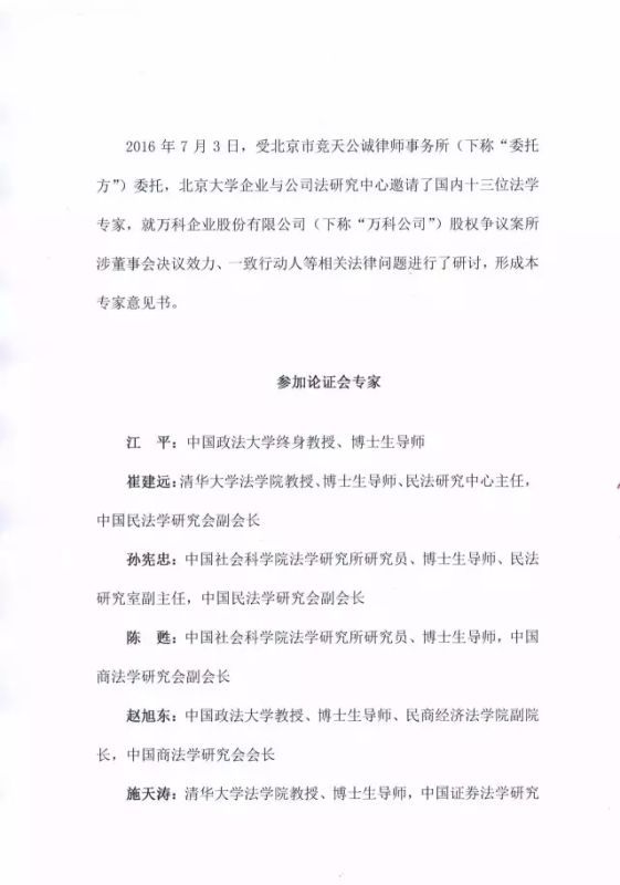 昨日晚6点,华润集团官方微信号发布《法律意见书》。《法律意见书》称7月3日,北京市竞天公诚律师事务所会同北大企业与公司法研究中心邀请国内13位权威法学专家召开了“万科股权争议论证会”。