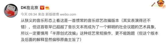 而二次创作应该在多大程度上脱离原作,一直是个争论不休的话题。但可以肯定的是,涉及到社会议题的歌曲在二次创作时一定不能偏离原作主旨。 正如乐评人邓柯所说,“从狭义的音乐形态上看这是一首惯常的音乐综艺改编版本(其实表演得还不错),但这首歌早已超越了音乐文本而成为了一个鲜明的社会议题的艺术具象,所以一定要慎用「半原创式改编」这种综艺常规操作,更不能跑题(但这个版本及后面的解释显然偏移原曲主旨了)”