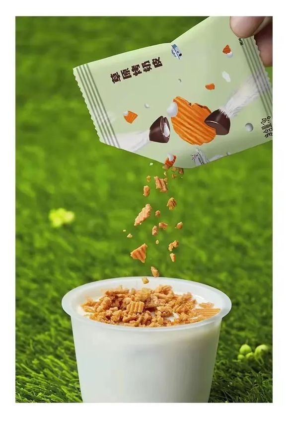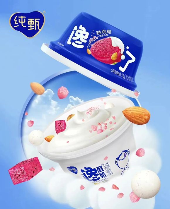 今年1月,蒙牛纯甄推出馋酸奶风味发酵乳。除了海盐巴旦木碎、 冻干红心火龙果丁、优脆乳等配料增加口感外,还添加了跳跳糖,从而带来更有层次的新奇体验。