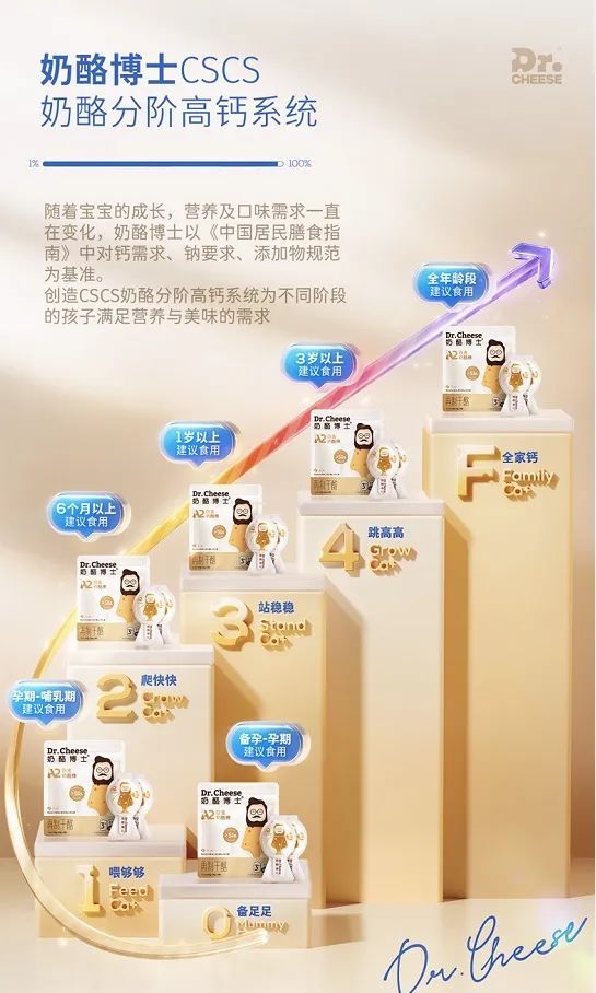 例如,在乳制品市场中,品牌开始更注重贴合中国宝宝的营养需求设计产品。奶酪博士就推出了“CSCS奶酪分阶高钙系统”,以《中国居民膳食指南》中对钙需求、钠要求、添加物规范为基准设计。通过分阶系统为不同年龄段的宝宝,对应推荐不同侧重点的产品。