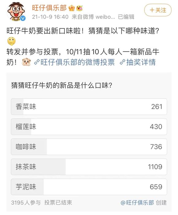 旺仔牛奶在出新口味时在旺仔官方微博上发起了投票;图片来源:微博@旺仔俱乐部
