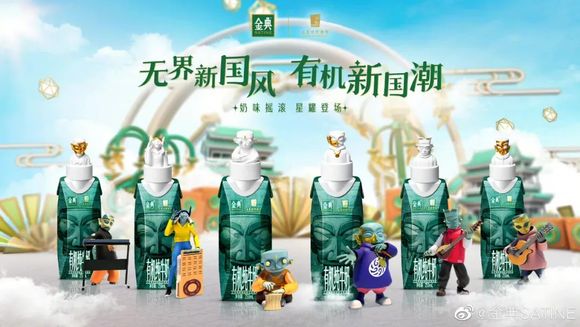 金典和三星堆博物馆联名推出限量款联名包装牛奶,加入了三星堆元素。此外,还以三星堆文物为原型,用不同造型的三星堆形象组建了一个“虚拟摇滚乐队”。