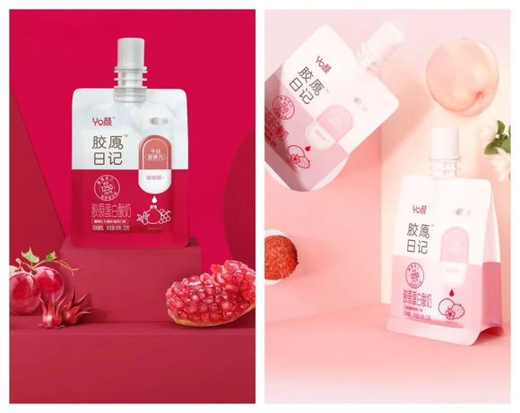 三元YO颜推出胶原日记酸奶,每袋含有1250毫克的德国进口小分子胶原蛋白肽,使用赤藓糖醇代替白砂糖,每100g热量仅为68大卡。品牌还表示,产品采用易于携带的可吸包装,加强了健康零食随时食用“变美”的属性,消费者在美味的同时降低了对保养肌肤的焦虑,获得“双重快乐”。