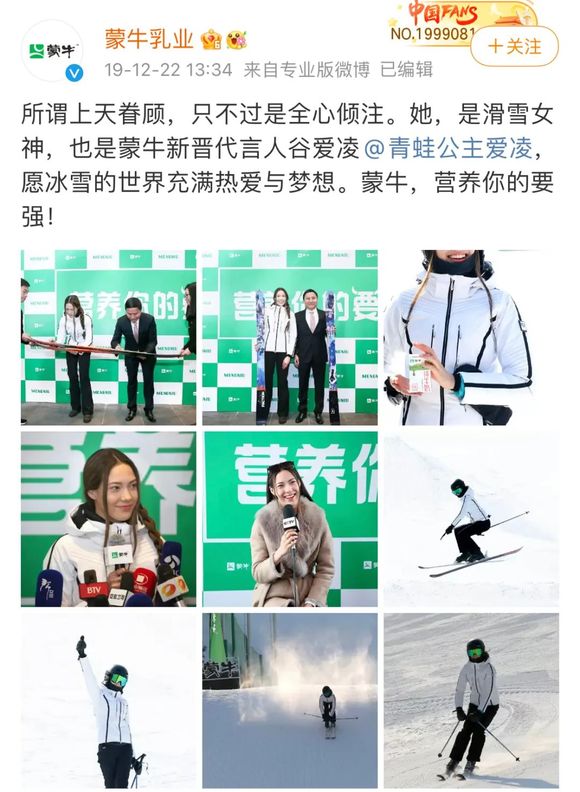 蒙牛在2019年底官宣谷爱凌成为品牌代言人;图片来源:微博@蒙牛乳业
