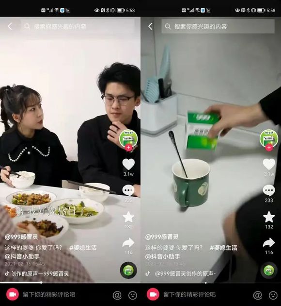 打开抖音搜索999感冒灵,已发的几个短视频全部是剧情类,故事从婆媳生活到夫妻情感,主角总是在关键时候拿出999感冒灵,表达对对方的关心和爱,将999和家庭进行强绑定。