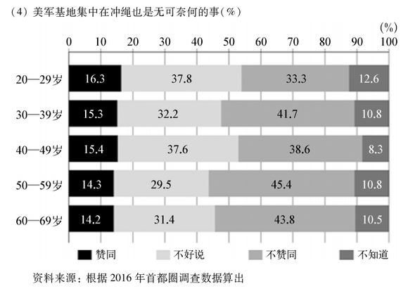 对于“不希望自己居住的地区外国人越来越多”一题,赞同与反对基本上各占一半。本国宪法、拥有军队”一题,其结果与大多数舆论调查一样,反对的人大大超过了赞成的人。尤其是女性,反对的人高达56.5%。但是,如果将“无所谓”视为接受派,那么,就不得不承认,“赞成”+“接受”与“反对”是处于对立的观点。其后的“美军基地集中在冲绳也是无可奈何的事”的问题是这一调查中最怕看到结果的一道题目。结果,反对大大超过了赞成。但是,与上一题一样,若将“无所谓”视为接受派,那么,“赞同”+“接受”还稍微超出了“反对”一些。