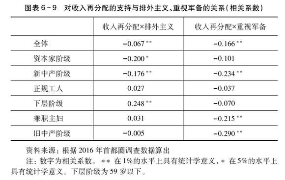首先来看一下不分阶级进行总体统计的情况。对收入再分配的支持与排外主义的相关系数为-0.067,与重视军备的相关系数为-0.166,两者皆为负数,这在统计学上是有意义的。它说明,从总体上来看,并不像支持收入再分配的人那样,都是支持排外主义的,此外,还表明总体上没有采取支持重视军备的立场。诚如预料的结果。