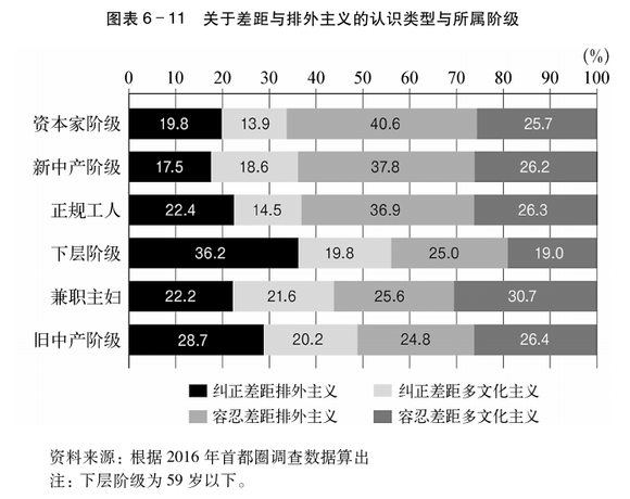 党派立场之外,阶级差异也在影响排外程度。桥本健二认为,经典资本主义社会的二元结构(资本家阶级-工人阶级)早已不适用于分析日本现状。首先,随着资本主义的发展,原本由资本家阶级自行管理的部分业务被委托给了工人阶级当中的部分成员,“新中产阶级”随之出现,他们即是哈佛大学中日研究专家傅高义在战后日本观察到的“工薪族”(salary men),虽然他们就出卖劳动力获取工资这一点与工人阶级无异,但其地位高于工人阶级。与此同时,工人阶级内部也出现分化,在被雇佣的文员、销售、服务及其他体力劳动者之外,还出现了由非正规工人构成的“下层阶级”,再加上由自营业者及家庭从业者构成的“旧中产阶级”,桥本健二提出日本的“新型阶级社会”由上述五个阶级构成。