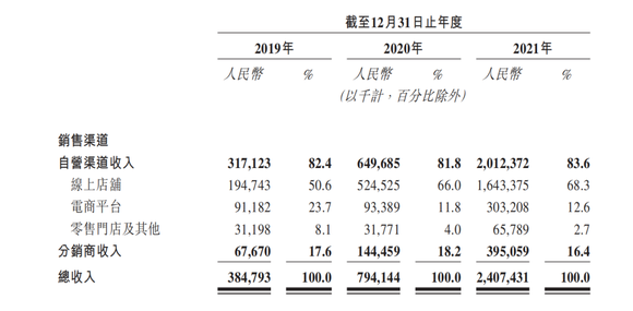 蕉下主要依赖第三方电商平台在线营销及销售产品。根据招股说明书,在线店铺及电商平台产生的收入由2019年的2.86亿元增至2020年的6.18亿元,并进一步增至2021年的19.47亿元,年复合增长率为160.9%。