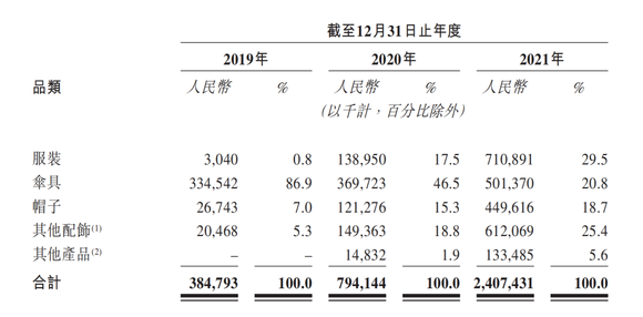 根据招股说明书,伞具2019年贡献了蕉下86.9%的销售额,2020年、2021年分别贡献了46.5%、20.8%,服装销售额占比则从2019年的0.8%增长至2020年、2021年的17.5%、29.5%。蕉下逐步成长为中国防晒服饰的市场引领者。