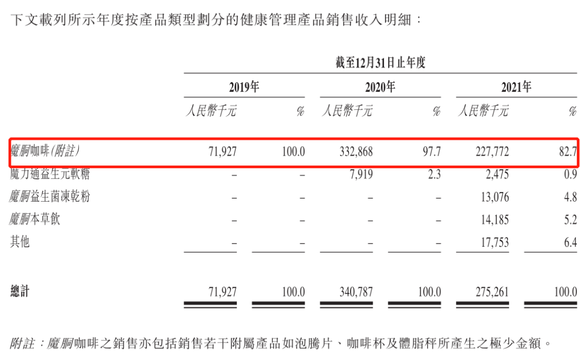 其中,魔胴咖啡无疑是健康管理产品中的扛把子,2019年~2021年分别实现营收0.72亿元,3.33亿元和2.28亿元,分别占健康管理产品总营收的100.0%,97.7%和82.7%,占公司总营收的83.0%,72.8%和62.3%。