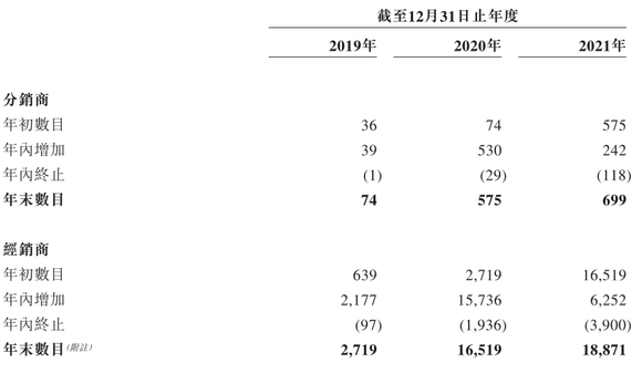 不过,由以上数据也可知,大约八成的经销商只拿了一次货。同时,招股书披露了分销商与经销商的数量变化。2020年是分销团队扩张最快的一年,而2021年不仅扩张速度下滑,分销商和经销商年内终止的数量分别为118名和3900名,几乎是新增数量的一半左右。可见分销商和经销商的生意,越来越不好做了。