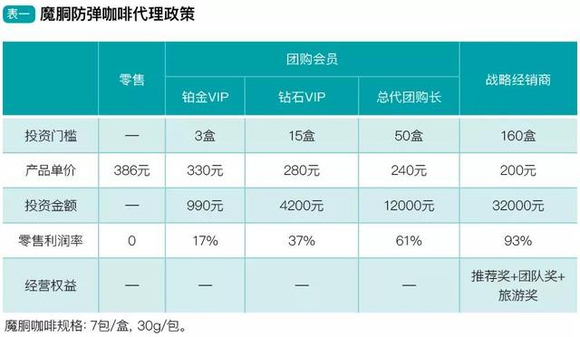 此外,值得注意的是,据北青网报道,相关代理商透露,魔胴咖啡有四个不同的代理级别,铂金VIP、钻石VIP、总代团购长和战略经销商。