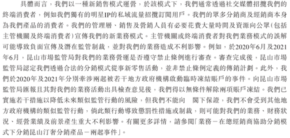 对此,巨星传奇表示公司以「一种新销售模式运营」,并通过社交媒体招揽终端消费者,而众多分销商及经销商本身也是产品的消费者。巨星传奇也承认,主管机关或终端消费者对公司业务模式的误解可能导致负面宣传及潜在监管制裁,并对业务造成不利影响。