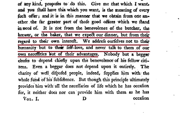 德国学者在一百年前提出了一个问题,他们认为亚当·斯密的两部著作,其基本观点是不兼容的,甚至是相互对立的,由此否定英美主流经济学对于斯密经济学的认知和推崇。在他们看来,一个大师级别的理论家怎么会有两个不相容的基本观点呢?在《国民财富论》一书中,斯密创立了一套基于理性自利人的现代资本主义的自由市场经济的经济理论。这个经济理论的基本假设是存在着一个理性的自利人,作为个人主义的自由自利主义者,他们参与市场经济,并在市场机制的调整之下,追求最大化的个人利益,从而塑造了一个现代经济秩序,包括从分工到交换和贸易以及分配等整个商品运作过程,由此促进了资本主义的经济发展与繁荣。所以,理性的自利人就是一个理性的经济人,这个经济人把市场利益视为个人自由参与市场的出发点,每个人只有具备这种以自利为主导的经济人理性,才能形成资本主义的市场经济。现代经济学就是以理性经济人或自利人为基本假设而建立起来的,其中关于劳动分工、等价交换、自由贸易和有限政府等一系列经济学的基本原理,都需要这个前提的预设,否则,现代市场经济秩序就难以实现。在斯密经济学理论的视野之下,道德学或伦理学是不存在的,或者说,在自由市场经济领域,是不需要甚至是排斥道德哲学的,只能以理性经济人的自利假设为基点,以经济效益、市场均衡、利益优化、成本效率等为经济行为的标准。