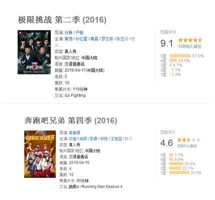 在收视率、全网播放量、微博话题热度上,《跑男》的优势很明显。但是在口碑上,《奔跑吧兄弟》一季比一季差,而《极限挑战》的口碑越来越好。