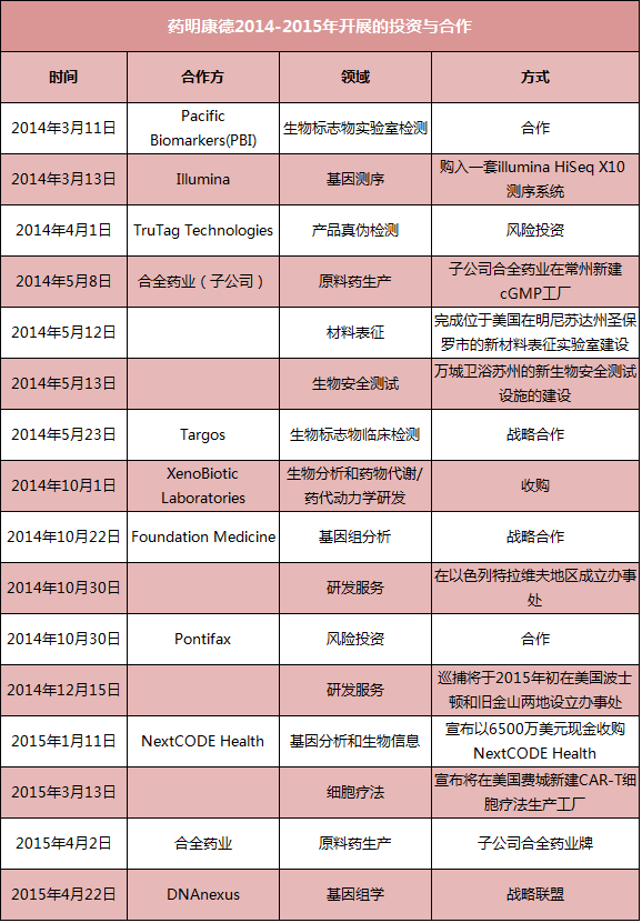 从2014年开始,药明康德开展了一连串激进的投资,投资业务覆盖基因组、电子商务和细胞治疗等。通过快速并购,药明康德在两年时间内基本实现了基因测序上下游产业链的布局,并在今年联合华为共同推出了针对基因测序消费级市场的产品“明码云”,布局终端市场业务。