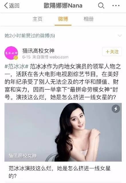 是的,最近招黑不断的欧阳娜娜又上榜啦~原因是欧阳娜娜疑似手滑点赞了一条黑范冰冰的微博:范冰冰演技这么烂,她是怎么挤进一线女星的?随后又慌里慌张的取消了点赞。