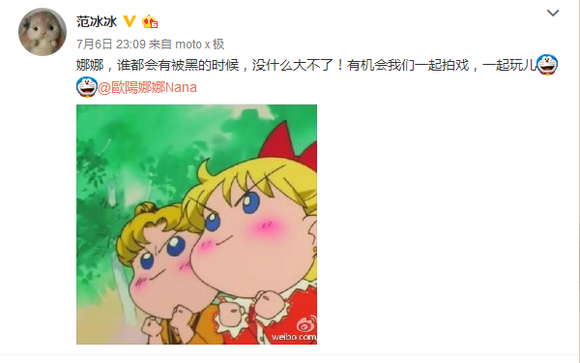 “娜娜,谁都会有被黑的时候,没什么大不了!有机会我们一起拍戏,一起玩儿”