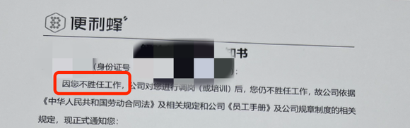 绪明和索罗都没有谈妥赔偿方案,也都收到了“不能胜任工作”的辞退通知书。随后,绪明在一些社交平台看到一些便利蜂员工和自己的遭遇一样——便利蜂给他发了两份辞退通知书,一份给他本人,另一份发到他填写的老家地址。