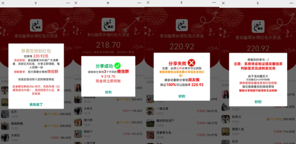 这只是“任务”的开始,继要求用户分享至微信群后,系统还会陆续将“任务”更新为“分享至3个微信群”、“分享至朋友圈”。与此同时,下方会不断弹出有用户红包到账的消息,刺激分享者。